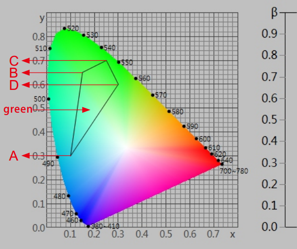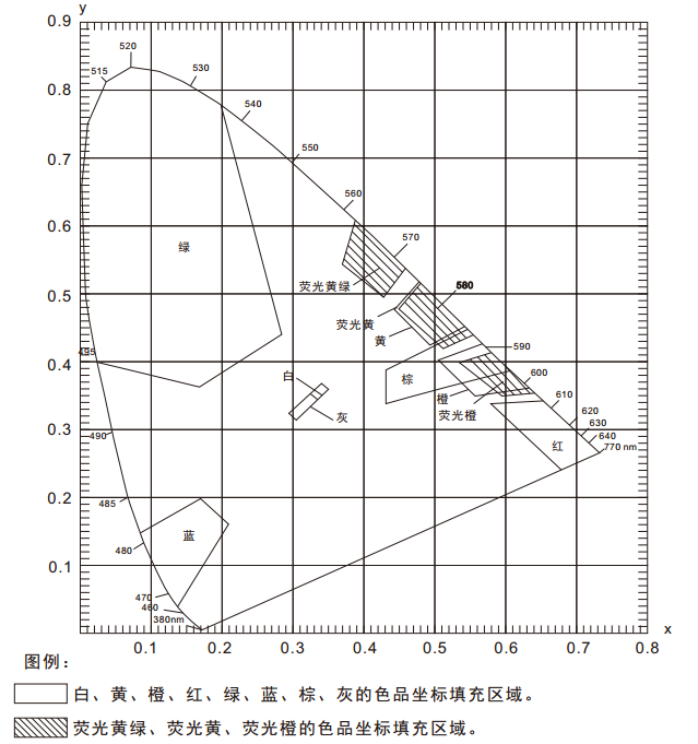 在《GB 2893安全色》、《GB/T 18833道路交通反光膜》等相關标準中,通常給出一塊顔色區域(多個色品坐标點)和亮度因數要求,在D65/A光源和45/0幾何條件下,判定樣品是否落在對應的顔色區域内,借此判定樣品是否滿足标準規定的色度要求。由於顔色區域爲多邊形,如下圖所示,導緻使用普通的分光測色儀無法完成判定。NS808測色儀配合SQCT軟件的交通路标測量模塊則可以輕松解決這方面的問題。