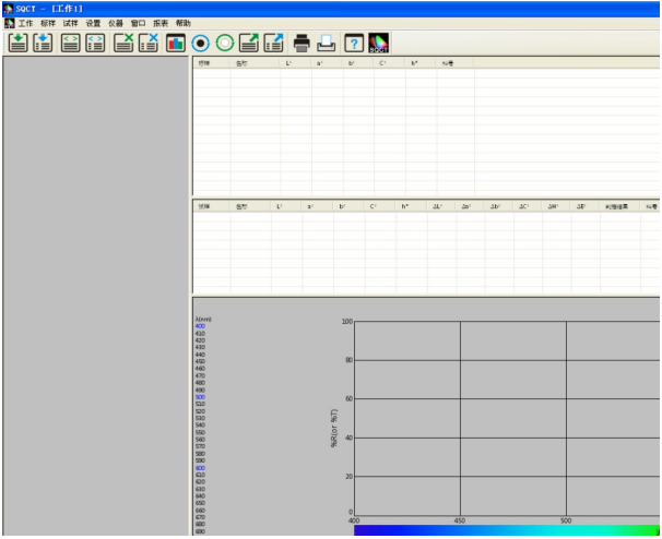 NS808的交通路标測(cè)試模塊主要是通過上位機軟件SQCT配合NS808儀器實現的。使用前需先安裝好SQCT上位機軟件,再連接NS808儀器,然後打開上位機軟件,默認爲普通測(cè)試界面,如圖1所示,在該界面下可以完成CIE L*a*b、XYZ、ΔE*ab、ΔE*cmc、ΔE*00等色度數據的測(cè)試,詳細菜單和工具欄的介紹請參(cān)照該軟件自帶“色彩管理控制軟件使用說明書”,這裏重點介紹交通路标測(cè)試模塊。