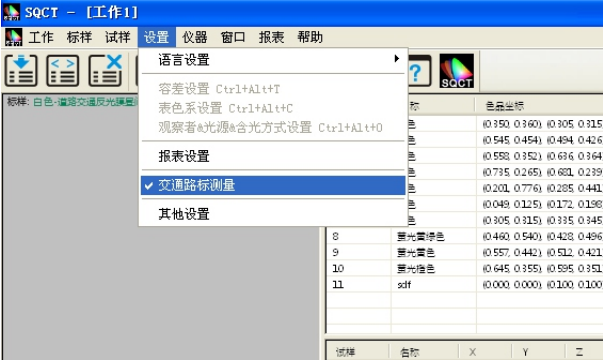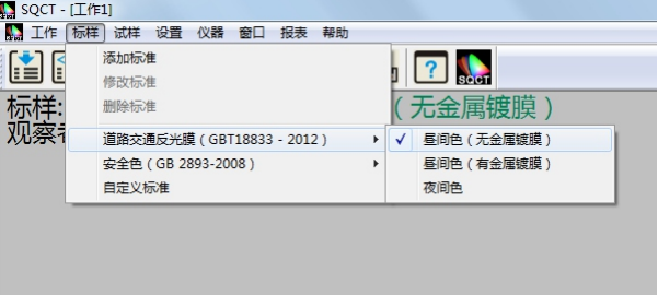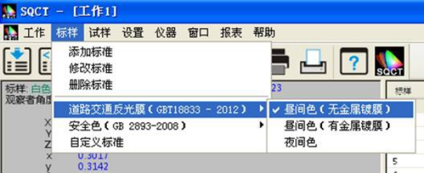 SQCT直接将《GB/T 18833-2012道路交通反光膜樣》的多邊形顔色區域做入軟件中,可以直接從菜單中選擇,“标樣->道路交通反光膜GB/T 18833->晝間色(無金屬鍍膜)”如圖11所示。