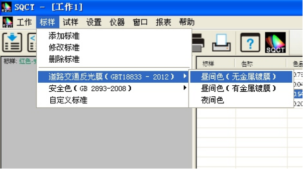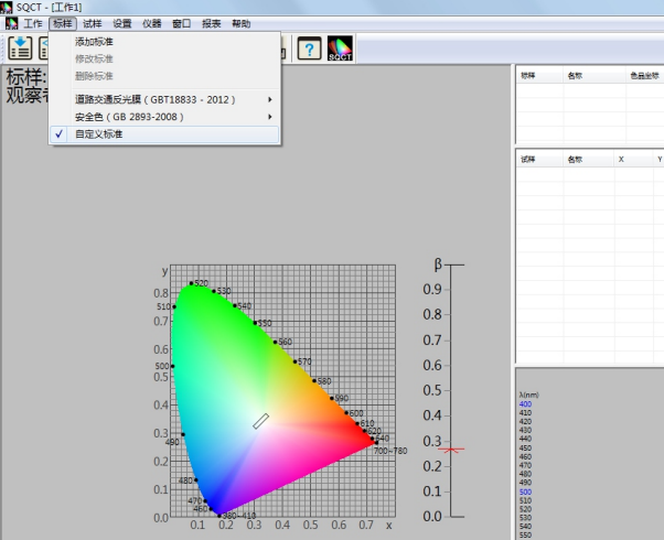針對國内交通路标使用較多的标準GB/T 18833,SQCT軟件将該标準中的标準色域納入其中,客戶隻需根據自己需要進行選擇即可。