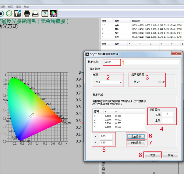 如圖5所示,在位置1處輸入标樣名稱,位置2處選擇光源種類(默認爲D65),位置3處選擇觀察者角度(默認爲2度),位置4處輸入亮度因數(除熒光物質外,普通反射樣品亮度因數大於0小於1,即0<β<1)。在位置5處輸入色品坐标點,然後點擊“添加頂點”按鈕,則新輸入的色品坐标點出現在标準色域框内,重複上述步驟,依次輸入各色品坐标點;對於輸入錯誤的色品坐标點,先在标準色域框内選中,然後點擊“删除頂點”按鈕,則删掉該頂點。全部輸入完畢,點擊位置8處“添加”按鈕,則完成“多邊形-容差标樣”建立。