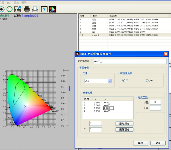 如圖7所示,修改上面建立的名稱爲“green”的多邊形-容差标樣,先選中該标準,然後可 以修改“标準名稱”“光源”“ 标準觀察者角度”“亮度因數”“色品坐标”,修改完畢,點擊“確定”按鈕,則修改生效。