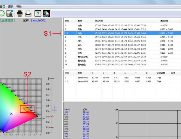 雙擊标樣區域的藍色,如圖12中是S3所示部分,使藍色爲當前标樣,藍色多邊形-容差标樣(《GB/T 18833-2012道路交通反光膜樣》規定的藍色區域)則顯示在S4部分。