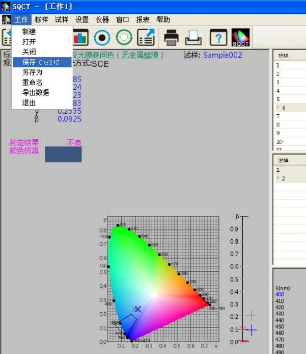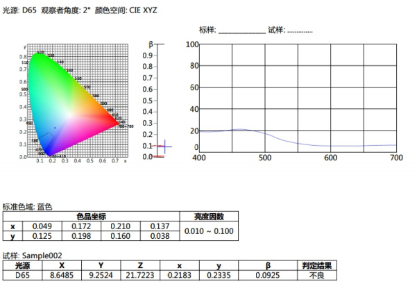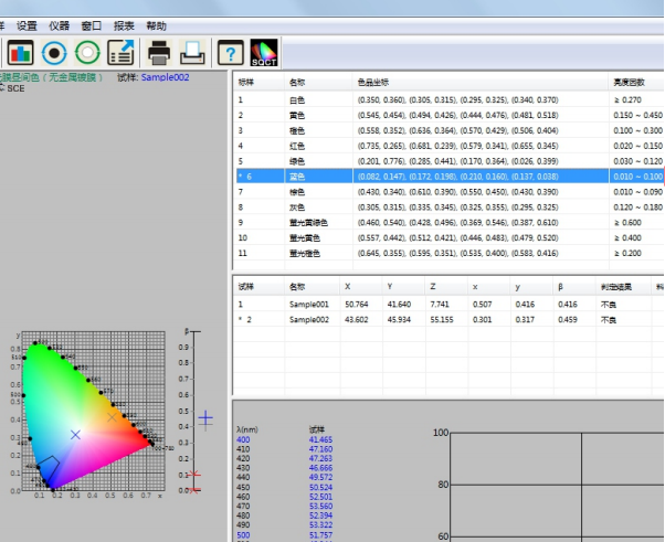 譬如如何判定藍色試樣是否在《GB/T 18833-2012道路交通反光膜樣》所規定的藍色區域内(無金屬鍍層,晝間反光膜顔色),按照下面的步驟,将依次完成測量和判定。