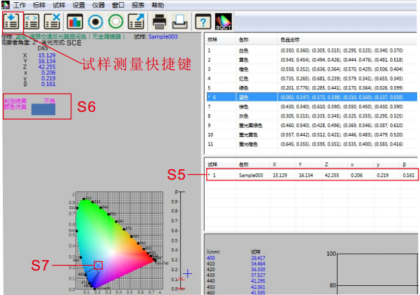 将測試樣品放在NS808測量口徑上,貼緊,鼠标點擊試樣測試快捷工具,如圖13所示。大約1.5秒時間,完成測試,測試數據如圖13中S5所示,在色品坐圖中的位置如S7所示,仿真及判定結果如S6部分所示。